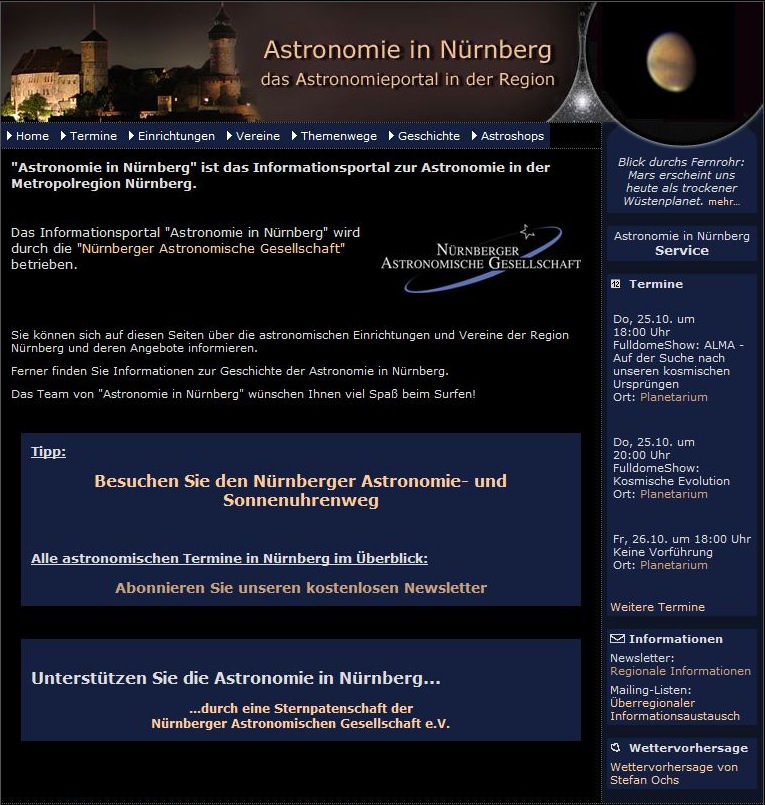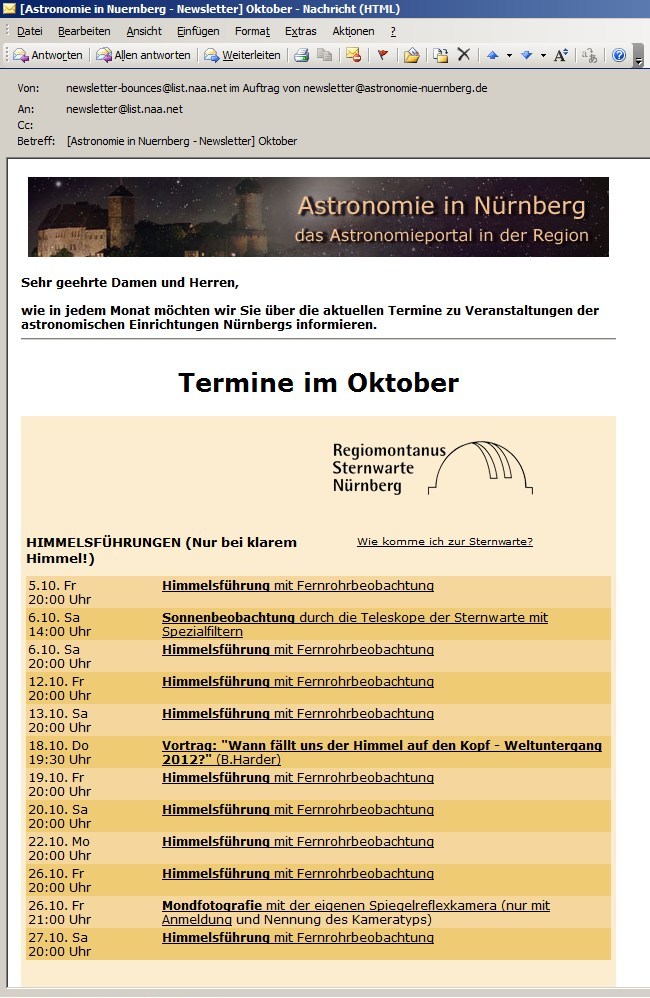 Newsletter mit Hinweisen zu astronomischen Aktivitäten in und um Nürnberg |