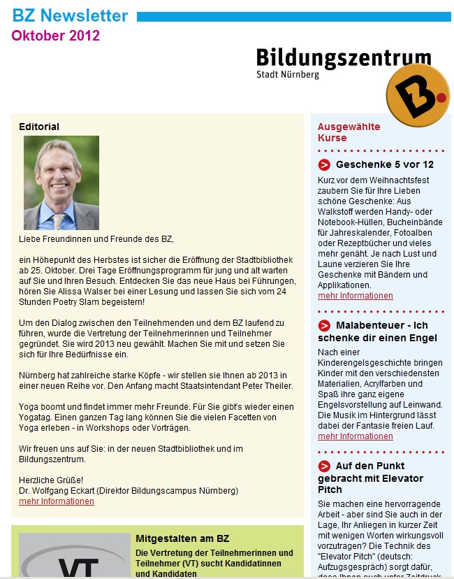 Monatliche Informationen über Veranstaltungen, Kursangebote und Neuigkeiten aus dem Bildungszentrum im Bildungscampus Nürnberg |