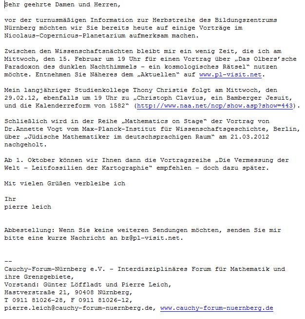 2–3 E-Mails pro Jahr mit Hinweisen über Vortragsreihen und Tagungen des Vereins im Großraum Nürnberg |